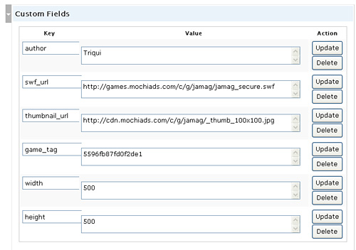 I wanted to save author name, swf and thumbnail urls, game tag and swf’s width and height.