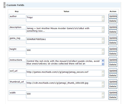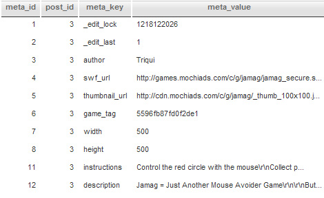 meta_key is the physical name of the key I assigned in this post Creation of a Flash arcade site using WordPress – step 2.