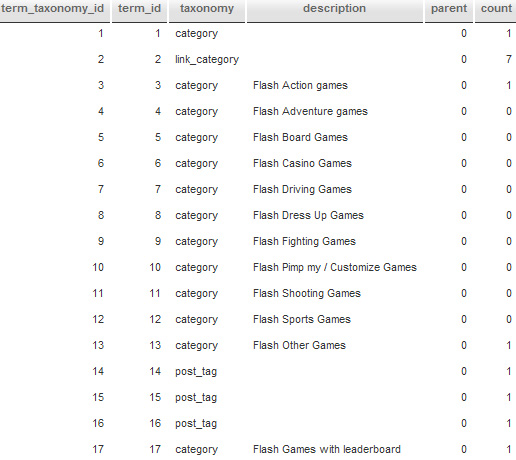 Now, let’s make a real world example: term_id 3 in terms table refers to something called Action with action slug… and looking for a 3 in the term_id column of the term_taxonomy table we know that “something” is a category with one post and described as Flash Action games.