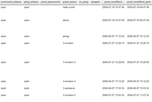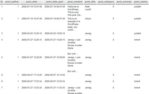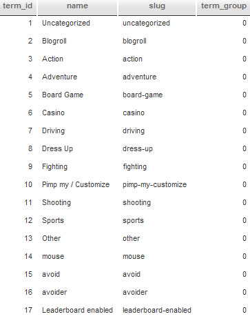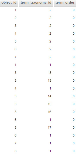 What do we know now? Well, since Jamag is object number 3 (you’ll see later why), we know from this table that the object 3 refers to term_taxonomy_ids 2, 3, 13, 14, 15, 16, 17 that mean blogroll (not interesting), Action, Other, mouse, avoid, avoider and Leaderboard enabled… that are the categories and the tags I assigned to Jamag.