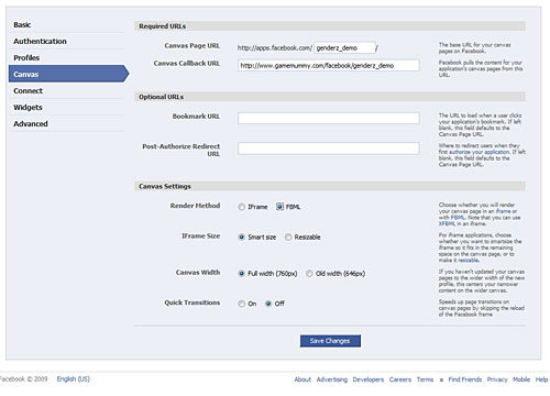 Here, you will b asked for a Canvas Page URL that is the unique url of your application. Being obviously unique, all best names have been already taken (just like .com domains). In Canvas Callback URL, you have to enter the URL of the page on your server that will host the application. Then set Render Method to FBML