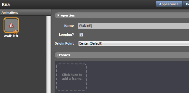Give a name to your animation (Walk left) in my case and click to create a new frame.