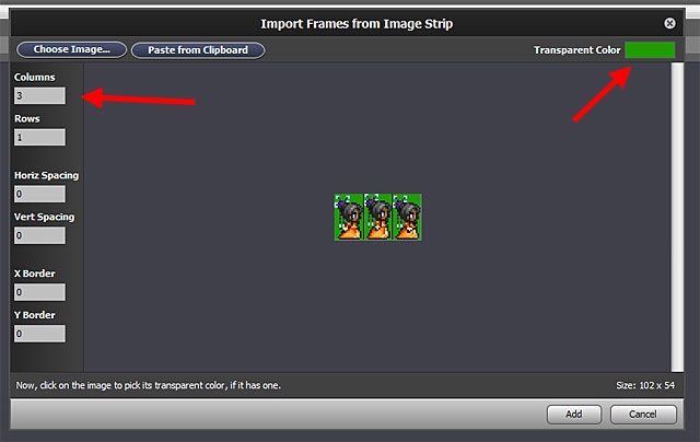 Here you can import your animation frame by frame, or even load an image strip and say how many rows and columns of frames you are going to import. And you can also define a transparent color. Nice one!! You’ll love this feature.