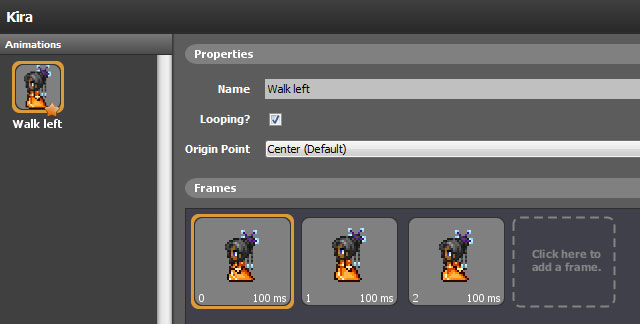 Since the image strip can be automatically split into frames, we already have the walk left animation up and running. In the left panel you can see an animated preview, while in the main panel you can control the animation frame by frame.
