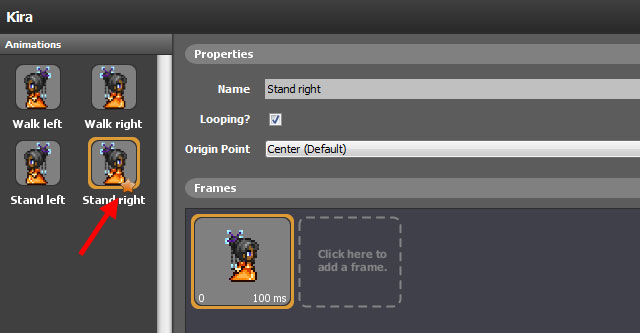 You can repeat this operation as many times as you want, creating new animations. Do you see the star under “Stand right” animation? This represents the default animation, that is the animation which will be played when the actor is placed in the game.