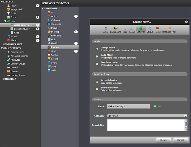 To create a game, the first thing we need is an actor. In Stencyl, everything which acts with its own behavior is an actor.