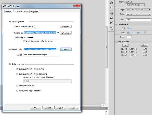 Fron now on, when you have to publish for iOS, you’ll just have to enter your certificate and provisioning profile