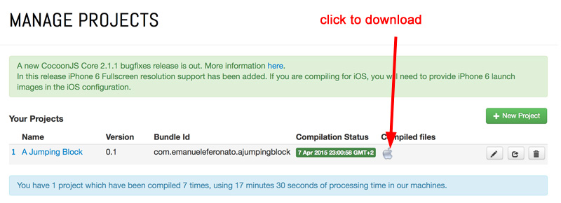 With CocoonJS everything always will be fine, so once you receive an email saying your project has been successfully compiled, go back to your dashboard and download it.