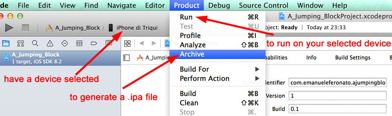 Once you have your project launched in Xcode with all certificates in their own place – don’t worry about it, Xcode will guide you if you did not install them before you try to compile – plug a device to your Mac and select it. Then you can choose “Archive” to create an .ipa file or “Run” to make it run directly in your device, as a native app.