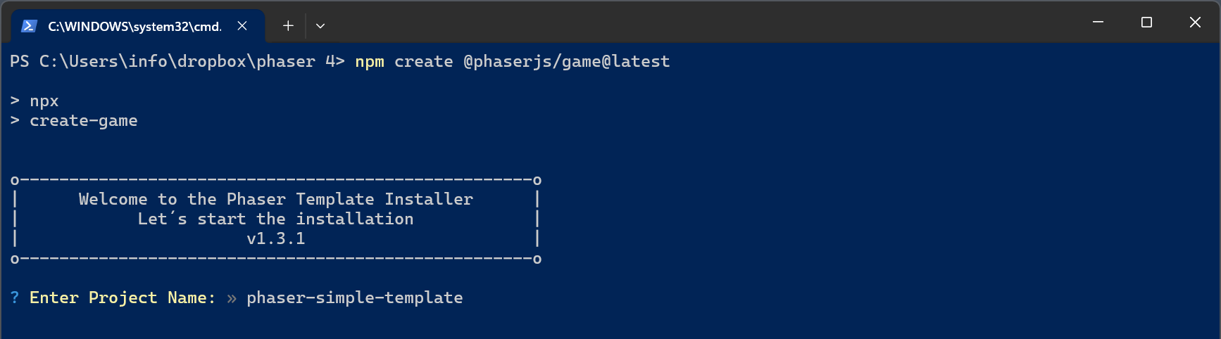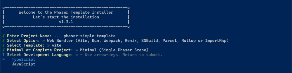 Once we are sure we have Node.js and npm installed, we can launch the Create Phaser Game app. Write in the CLI