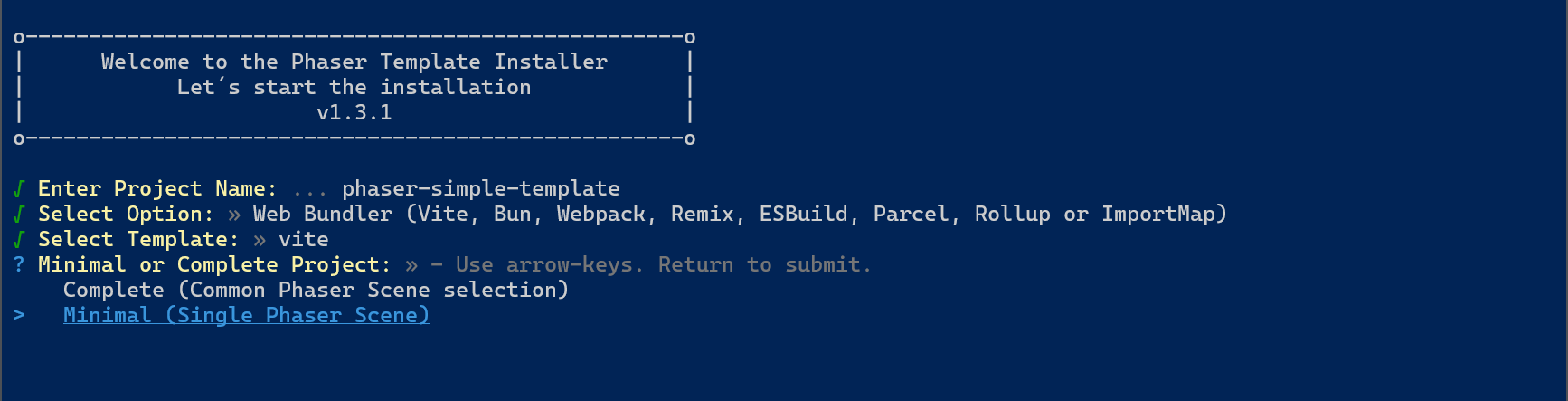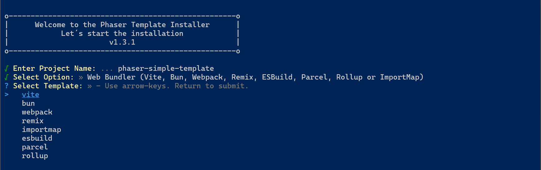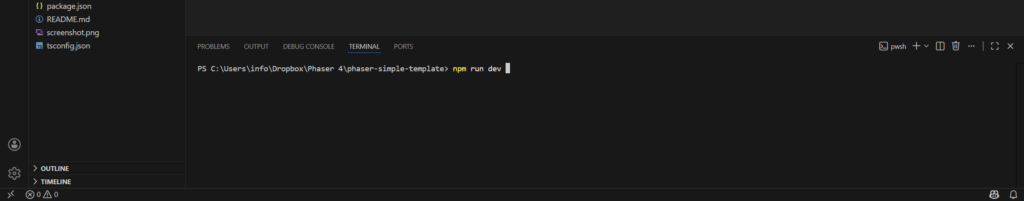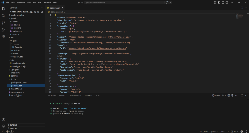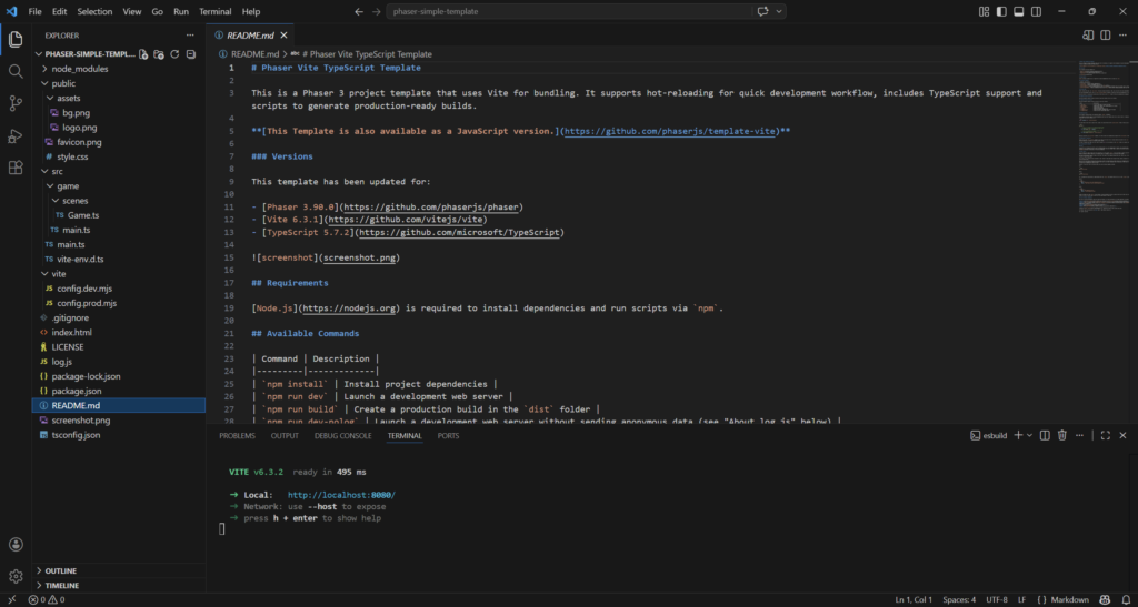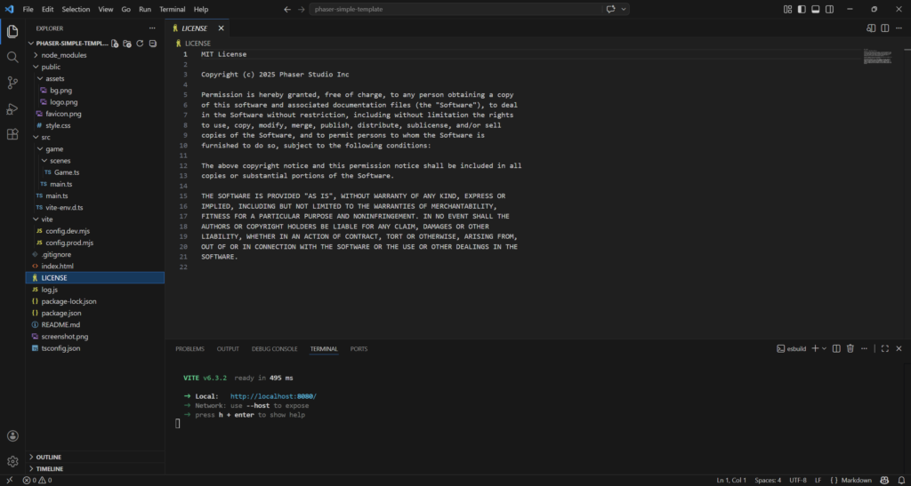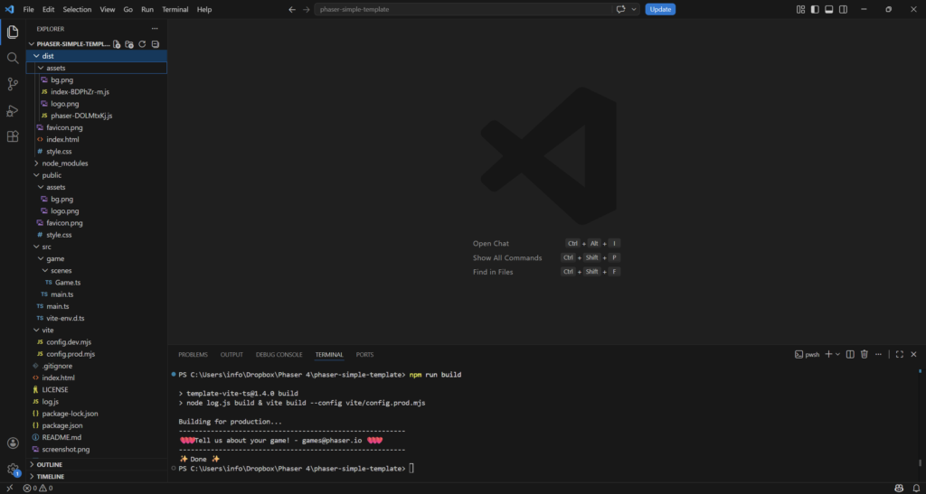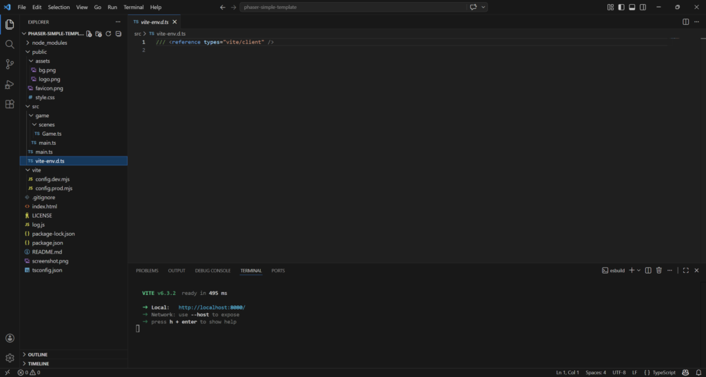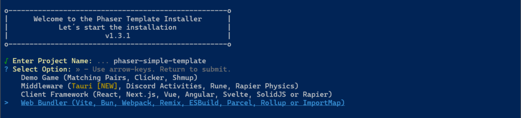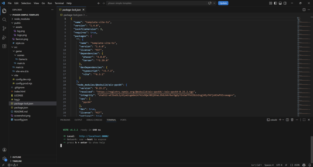 npm create @phaserjs/game@latestYou will be asked for the project name. The script will create a folder of the same name, with all required files. I called it phaser-simple-template.