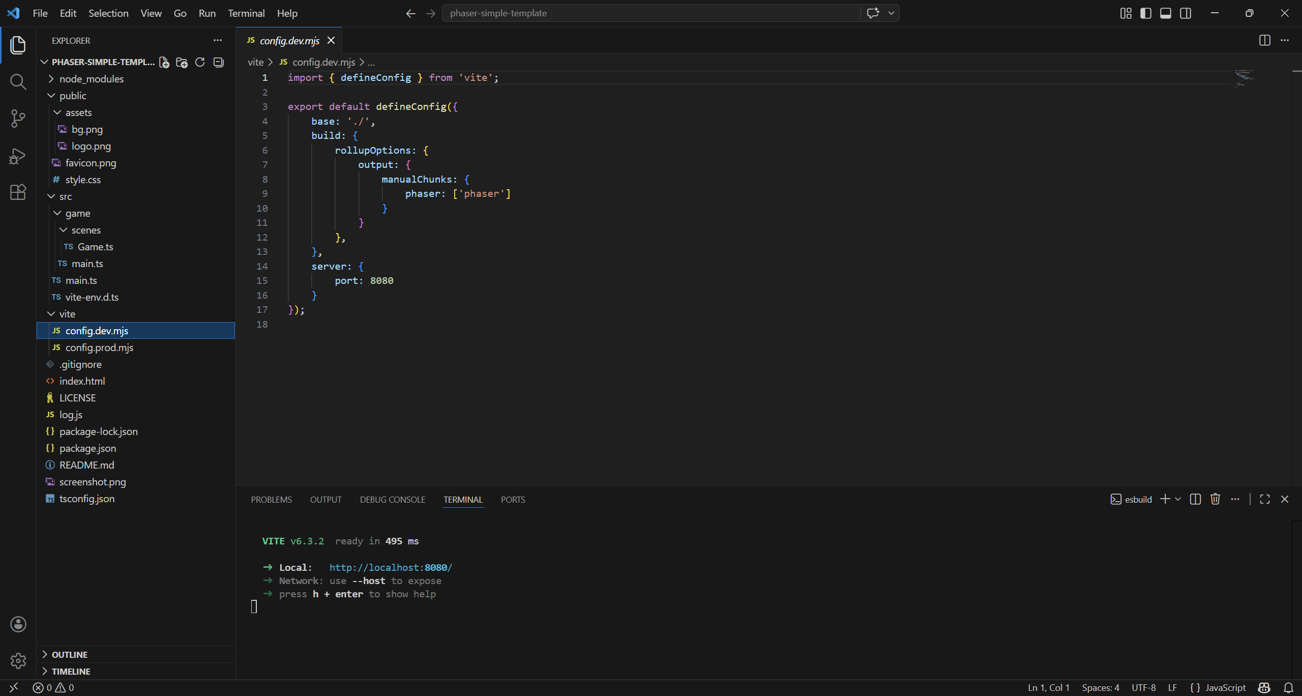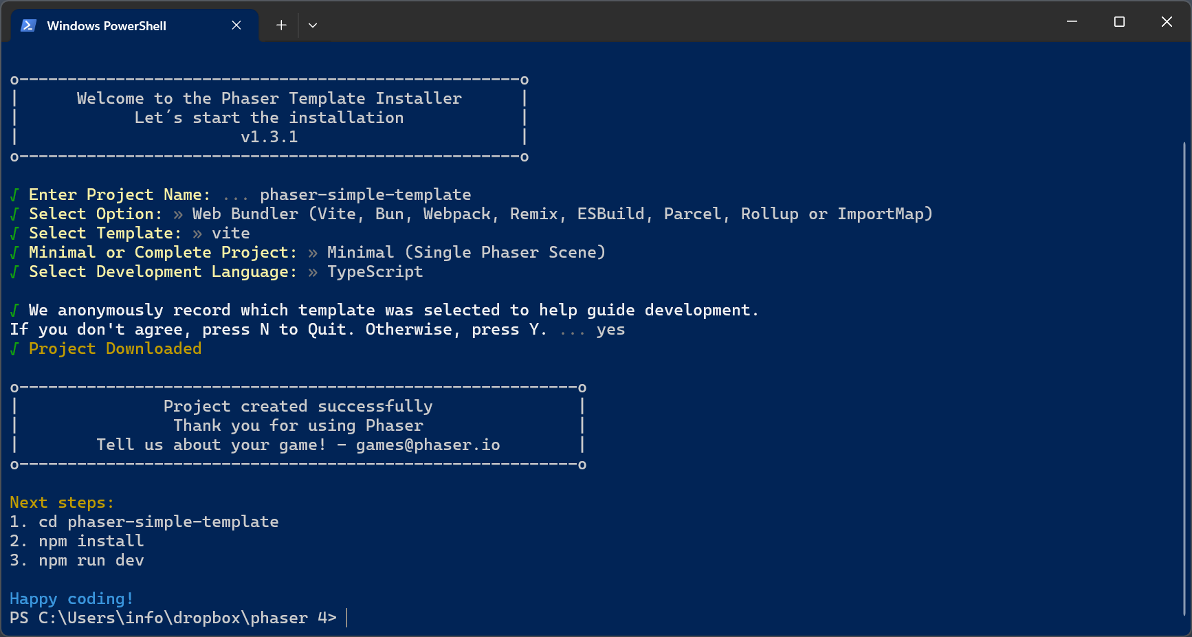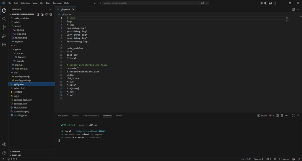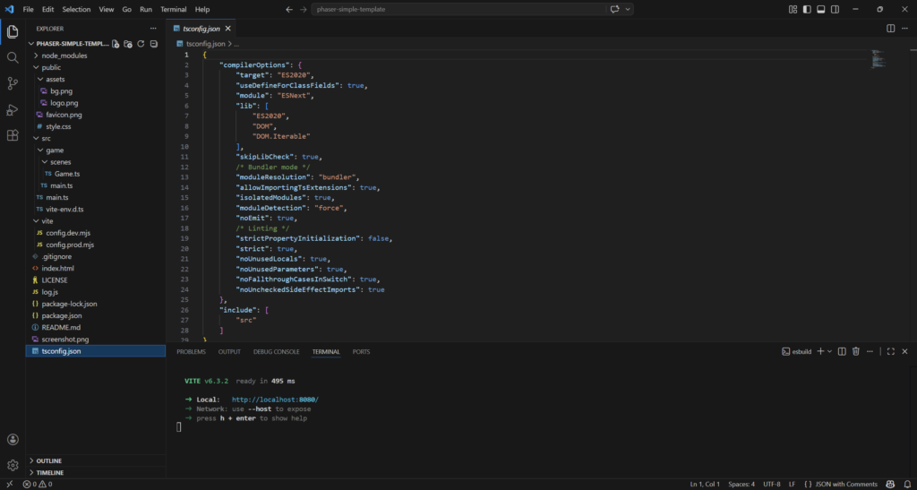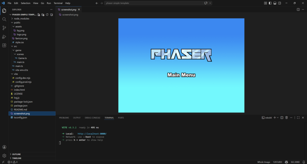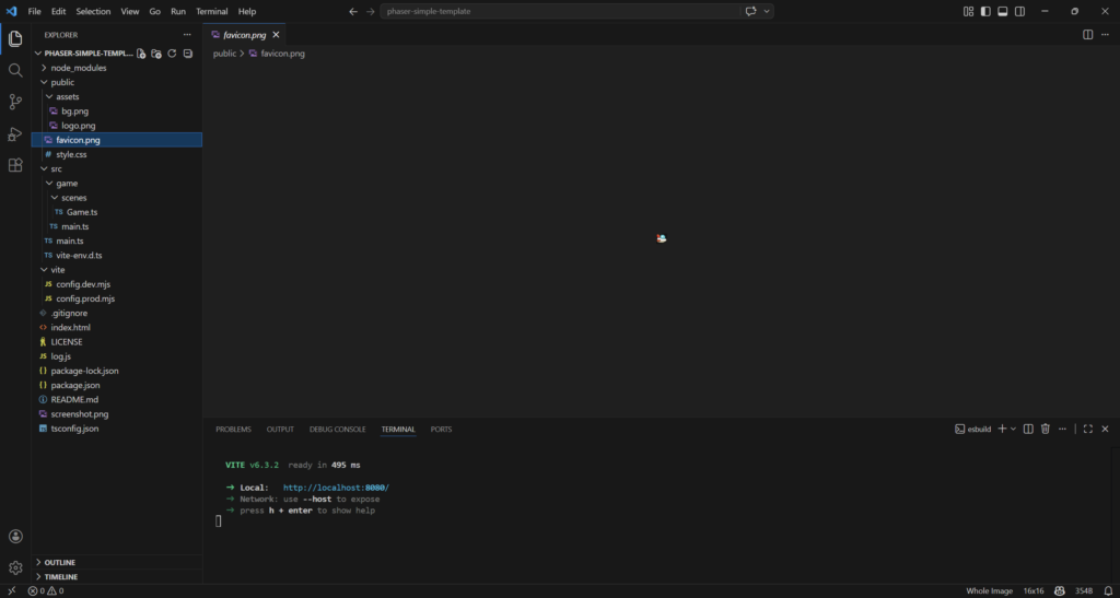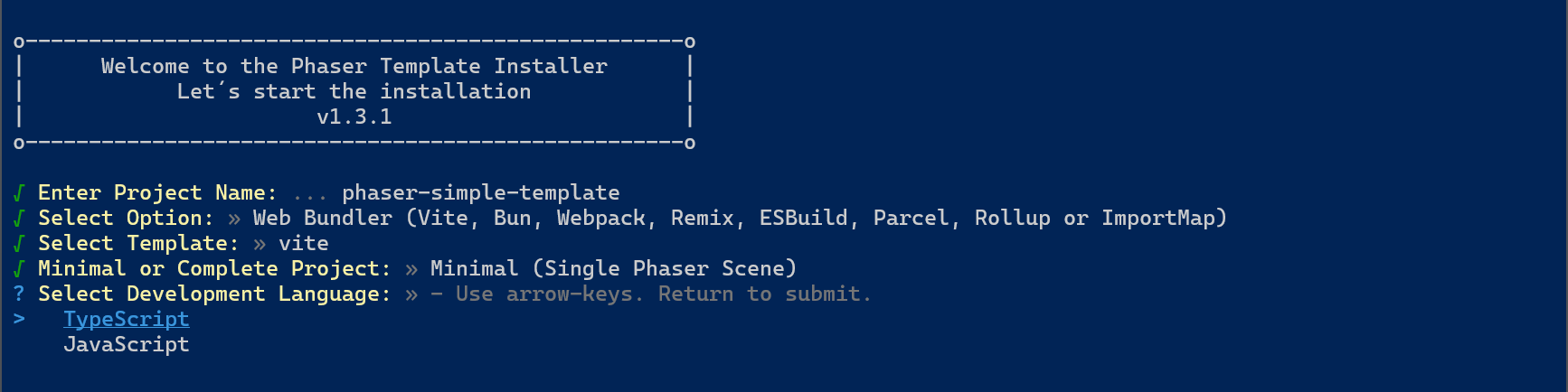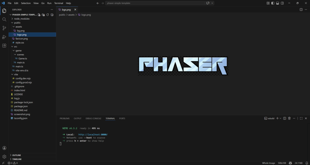 npm create @phaserjs/game@latestYou will be asked for the project name. The script will create a folder of the same name, with all required files. I called it phaser-simple-template.