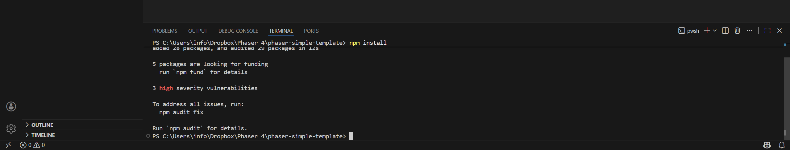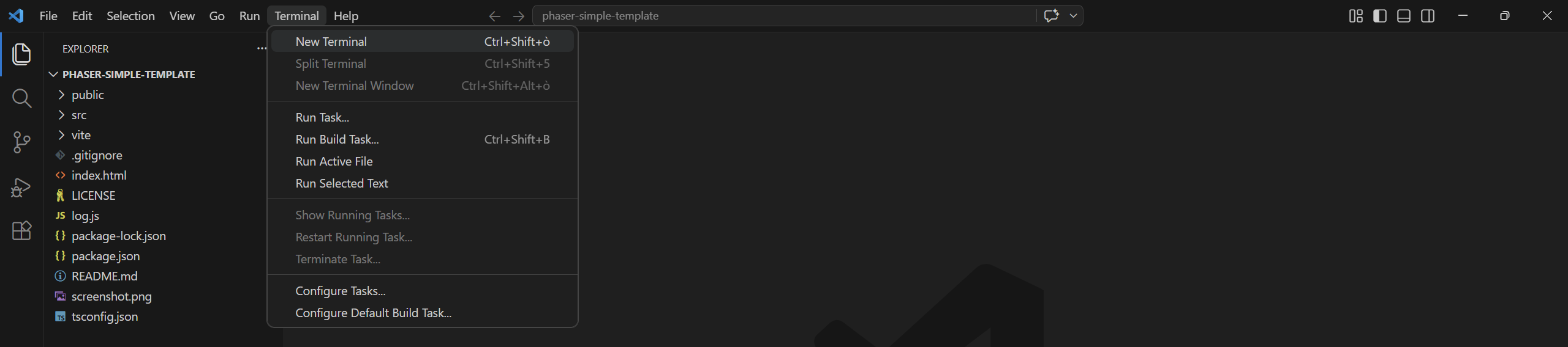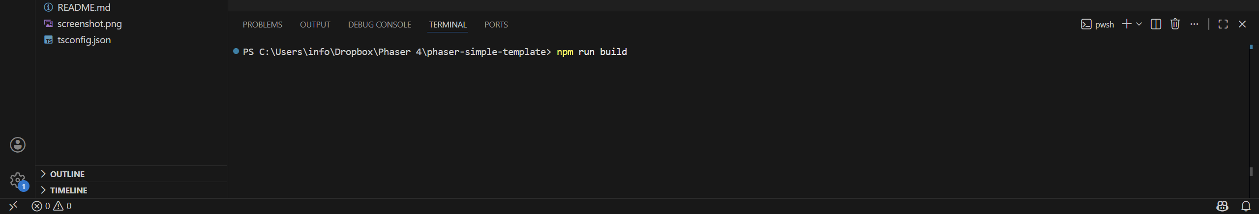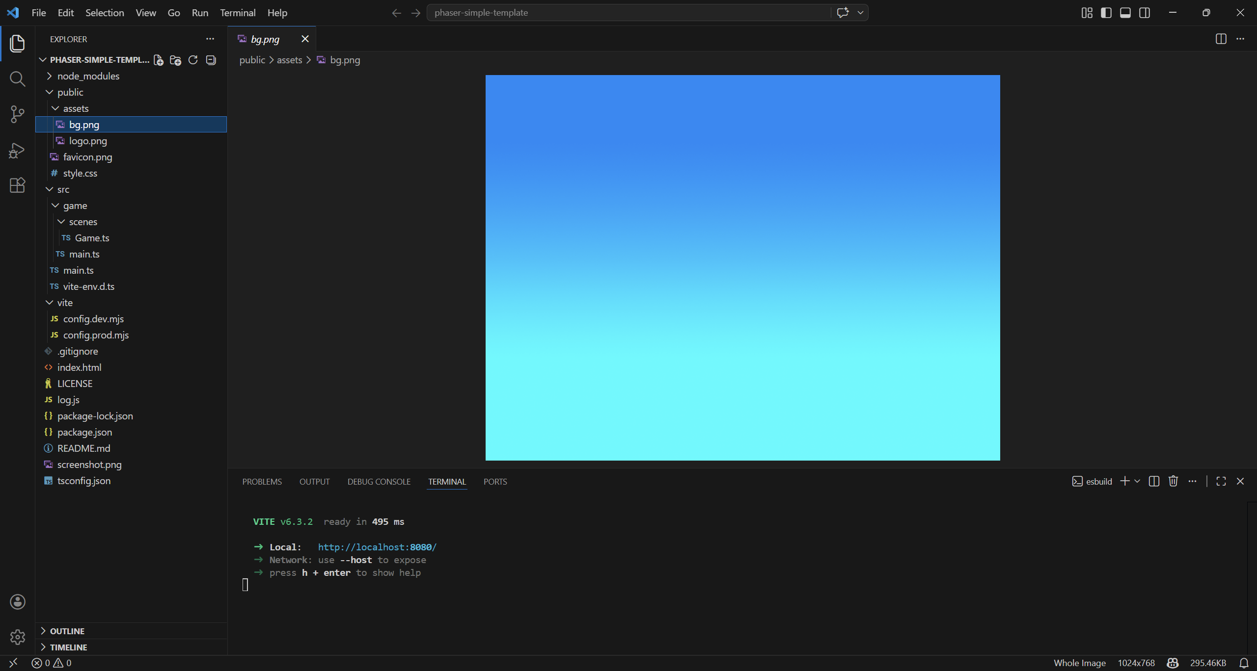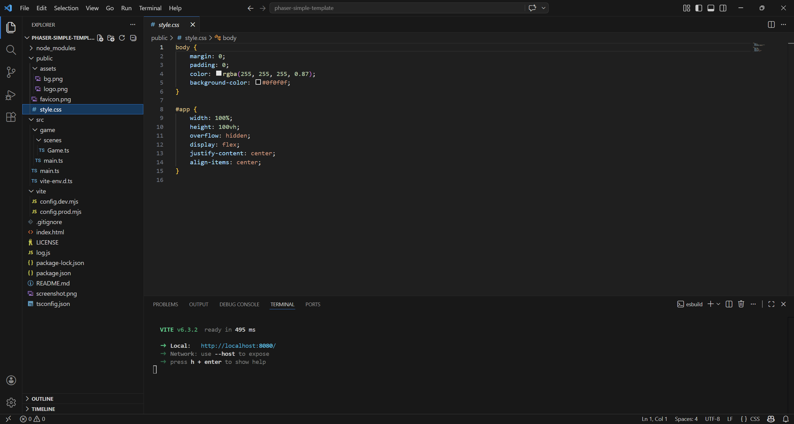 npm create @phaserjs/game@latestYou will be asked for the project name. The script will create a folder of the same name, with all required files. I called it phaser-simple-template.