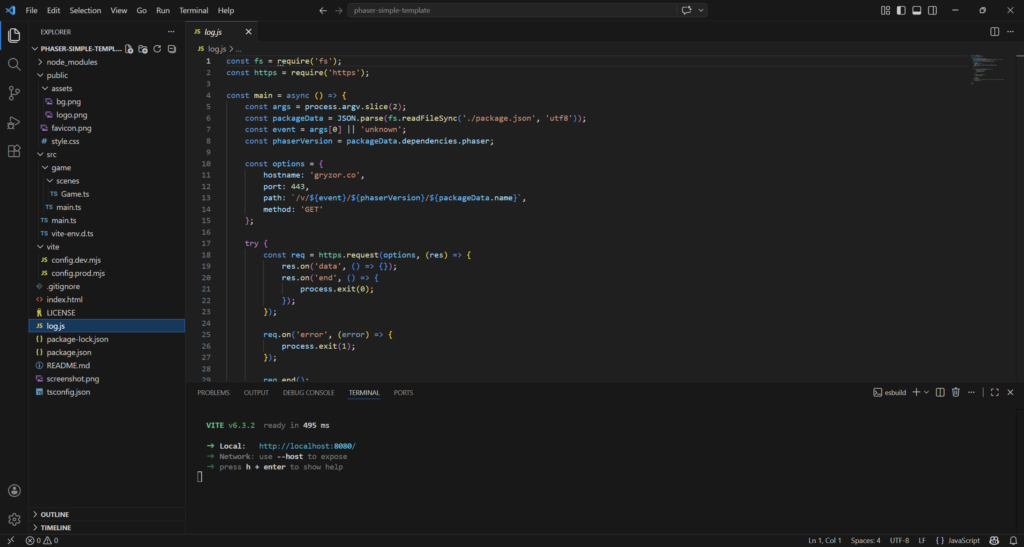 log.js is a small telemetry script that sends basic project info (like name and Phaser version) to a remote server. If you don’t want to send such information, you can delete it.