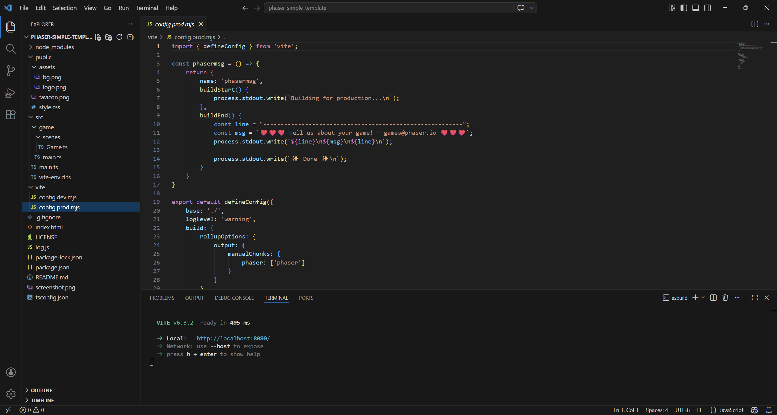 vite/config.prod.mjs configures Vite for building and serving the project, including optimization settings like minification and code splitting (separating Phaser into its own chunk). It also adds a custom plugin that prints friendly messages in the terminal during the build process.