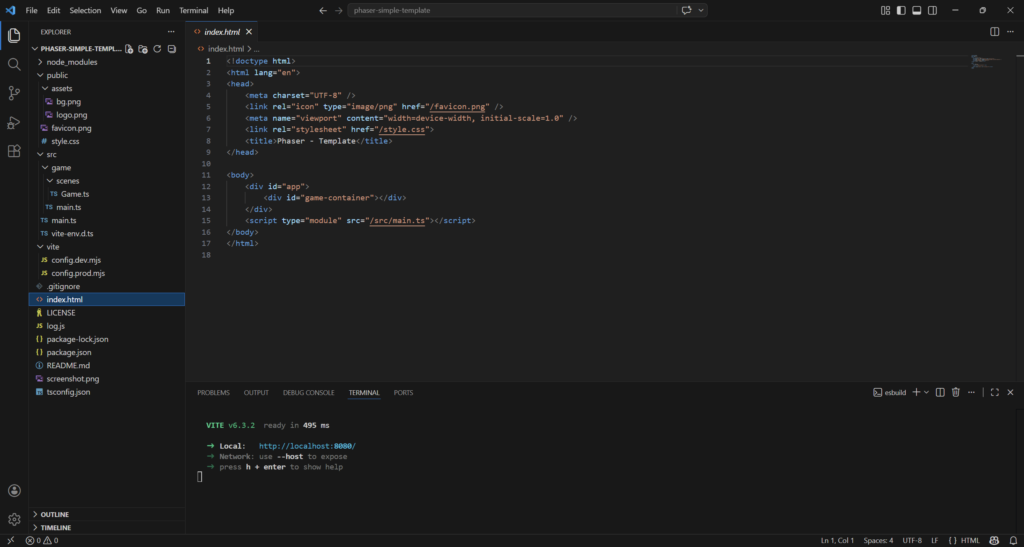 index.html is the entry point, the actual game HTML page. This HTML file sets up the page structure, including the container where the Phaser game will be rendered. It links the CSS for styling and loads the main TypeScript entry point that initializes the game.